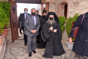 Μαζί με τον Σεβ. Χίου τους υψηλούς επισκέπτες υποδέχθηκε με ιδιαίτερη τιμή η Ηγουμένη της μονής Φιλοθέη και η Επιτροπή συμπαραστάσεως της Ιεράς Μονής. Στην είσοδο μάλιστα της Ιεράς Μονής εκτός της ελληνικής κυμάτιζε και η γαλλική Σημαία. Τους επισκέπτες συνόδευαν ο Υπουργός Μεταναστεύσεως κ. Παναγιώτης Μηταράκης, ο Πρέσβης της Γαλλίας στην Ελλάδα κ. Patrick Maisonnave και η Πρόξενος της Γαλλίας στην Χίο κ. Isabelle Kergoat.