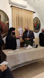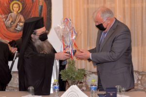 Οι επισκέπτες δέχθηκαν το μοναστηριακό κέρασμα στην τραπεζαρία της Ιεράς Μονής, ενώ αντήλλαξαν δώρα με βιβλία και χιώτικα προϊόντα από τον Σεβ. Μητροπολίτη Χίου κ. Μάρκο. Κατά την ανταλλαγή δώρων ο Σεβ. Χίου κ. Μάρκος προσφώνησε με μνημειώδη λόγο τον Πρόεδρο της Γαλλικής Γερουσίας.