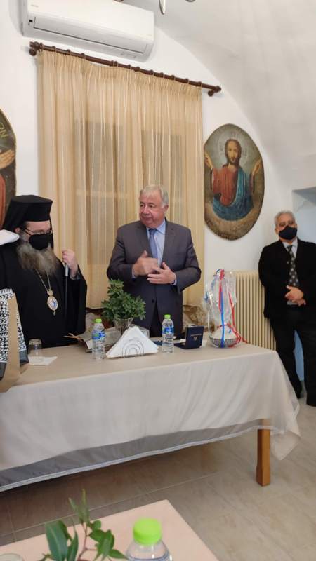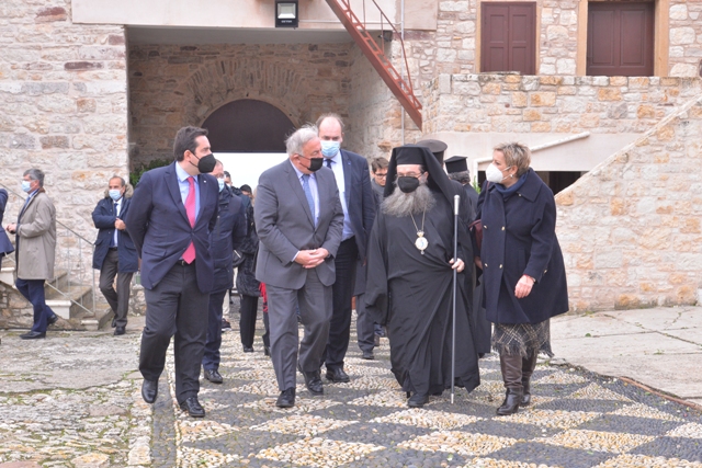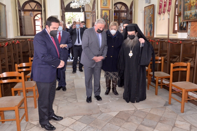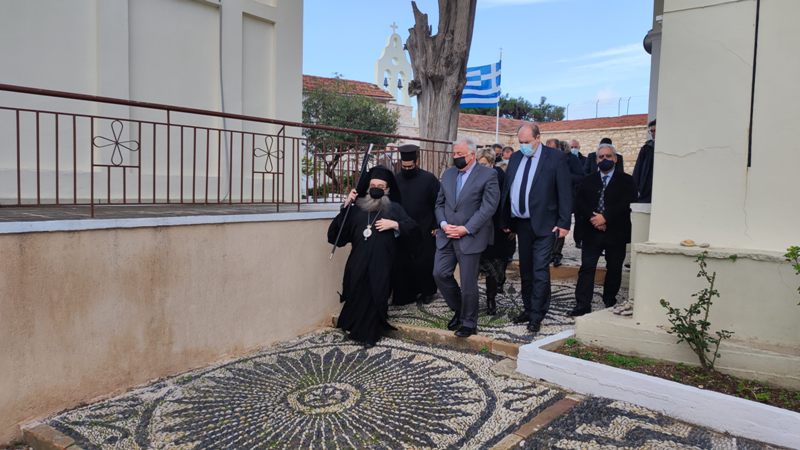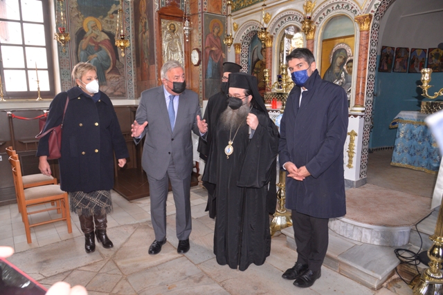 Μαζί με τον Σεβ. Χίου τους υψηλούς επισκέπτες υποδέχθηκε με ιδιαίτερη τιμή η Ηγουμένη της μονής Φιλοθέη και η Επιτροπή συμπαραστάσεως της Ιεράς Μονής. Στην είσοδο μάλιστα της Ιεράς Μονής εκτός της ελληνικής κυμάτιζε και η γαλλική Σημαία. Τους επισκέπτες συνόδευαν ο Υπουργός Μεταναστεύσεως κ. Παναγιώτης Μηταράκης, ο Πρέσβης της Γαλλίας στην Ελλάδα κ. Patrick Maisonnave και η Πρόξενος της Γαλλίας στην Χίο κ. Isabelle Kergoat.