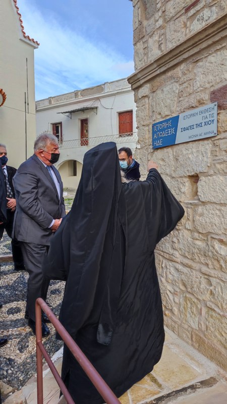 Ακολούθησε, με ιερή συγκίνηση, η επίσκεψη στο ολοκαυτωθέν από τους Τούρκους το 1822 και αιματόστικτο μέχρι σήμερα Καθολικό της Ιεράς Μονής, καθώς και στο οστεοφυλάκειο του ιερού παρεκκλησίου των Αγίων Τεσσαράκοντα Μαρτύρων, όπου ο πρόεδρος της Γαλλικής Γερουσίας κατέθεσε δάφνινο στεφάνι προς τιμή των νεκρών και στη συνέχεια μετέβησαν στο Ιστορικό Μουσείο των Σφαγών της Χίου «ΙΣΤΟΡΙΗΣ ΑΠΟΔΕΞΙΣ ΗΔΕ».