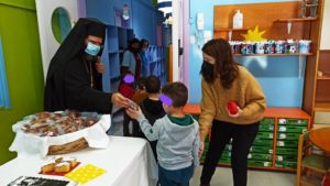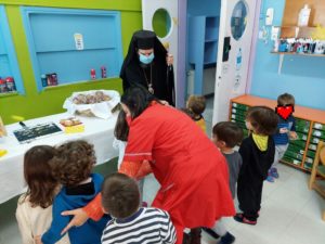 Ο Σεβασμιώτατος κ. Παντελεήμων μίλησε στα παιδιά και τους εξήγησε το έθιμο της Βασιλόπιττας, το έργο και τον βίο του Αγίου Βασιλείου και ευχήθηκε σε όλους καλή και ευλογημένη χρονιά.