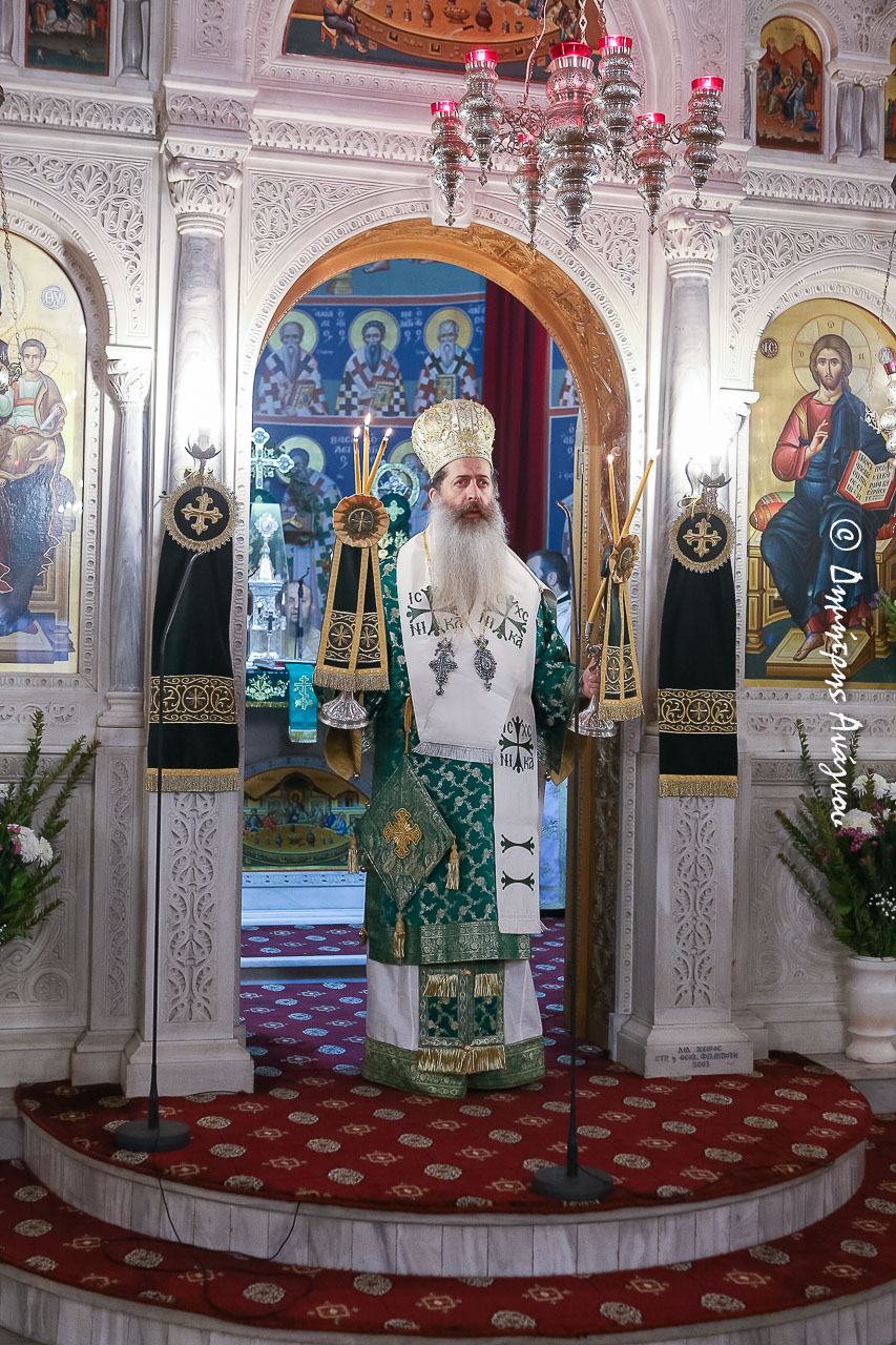 Στο κήρυγμά του ο Σεβασμιώτατος αναφέρθηκε στον μεγάλο και σύγχρονο Άγιο της εποχής μας, τον ταπεινό Ιερέα των Αθηνών και βλάστημα της νήσου Νάξου, Άγιο Νικόλαο Πλανά και συγκεκριμένα εστίασε την λόγο του στο χάρισμα της απλότητος, το οποίο, μαζί με τα άλλα πλούσια χαρίσματα του Αγίου Πνεύματος εστόλιζε την ψυχή του.