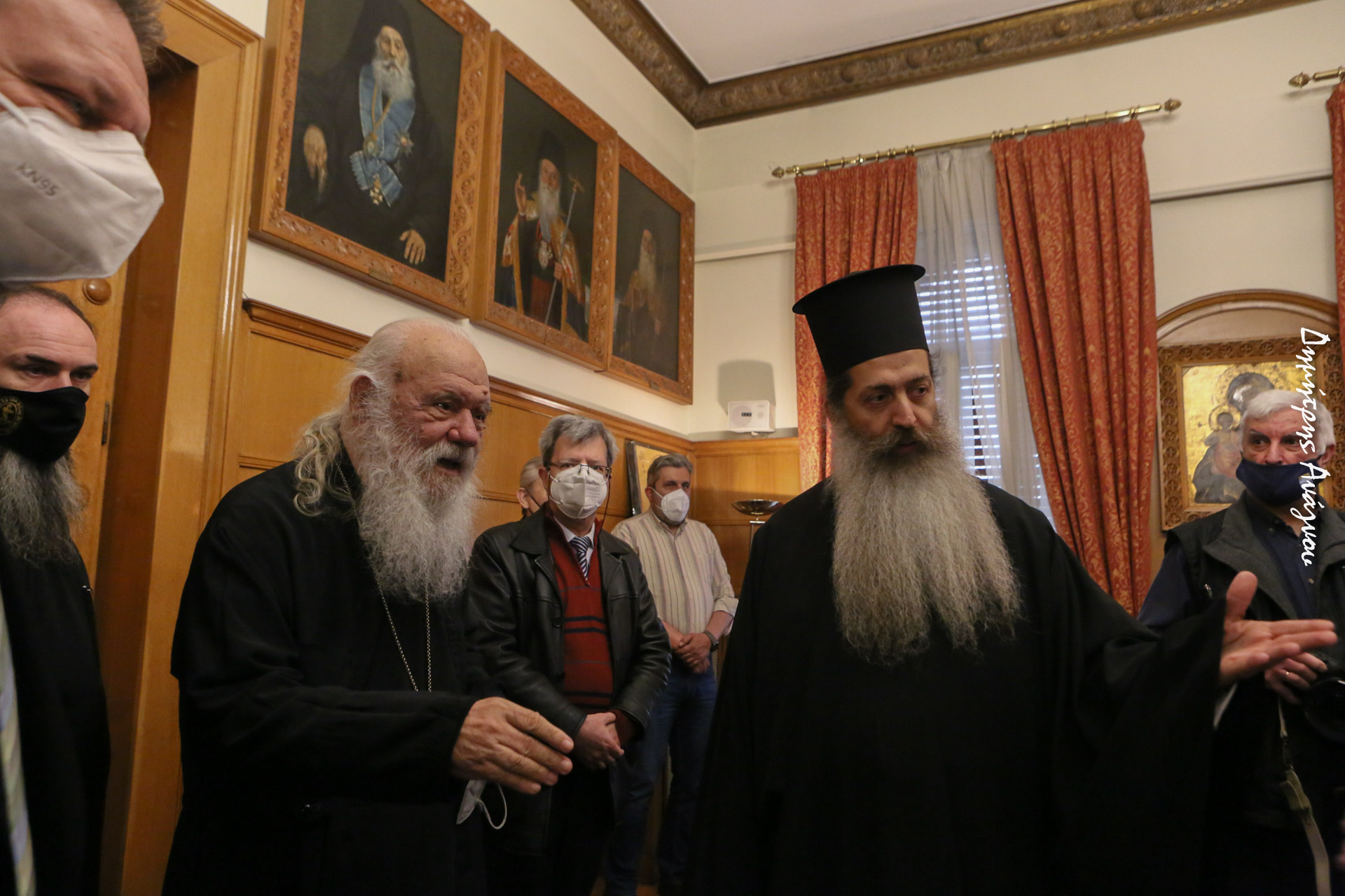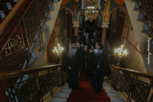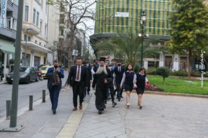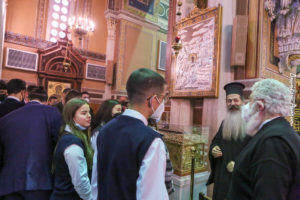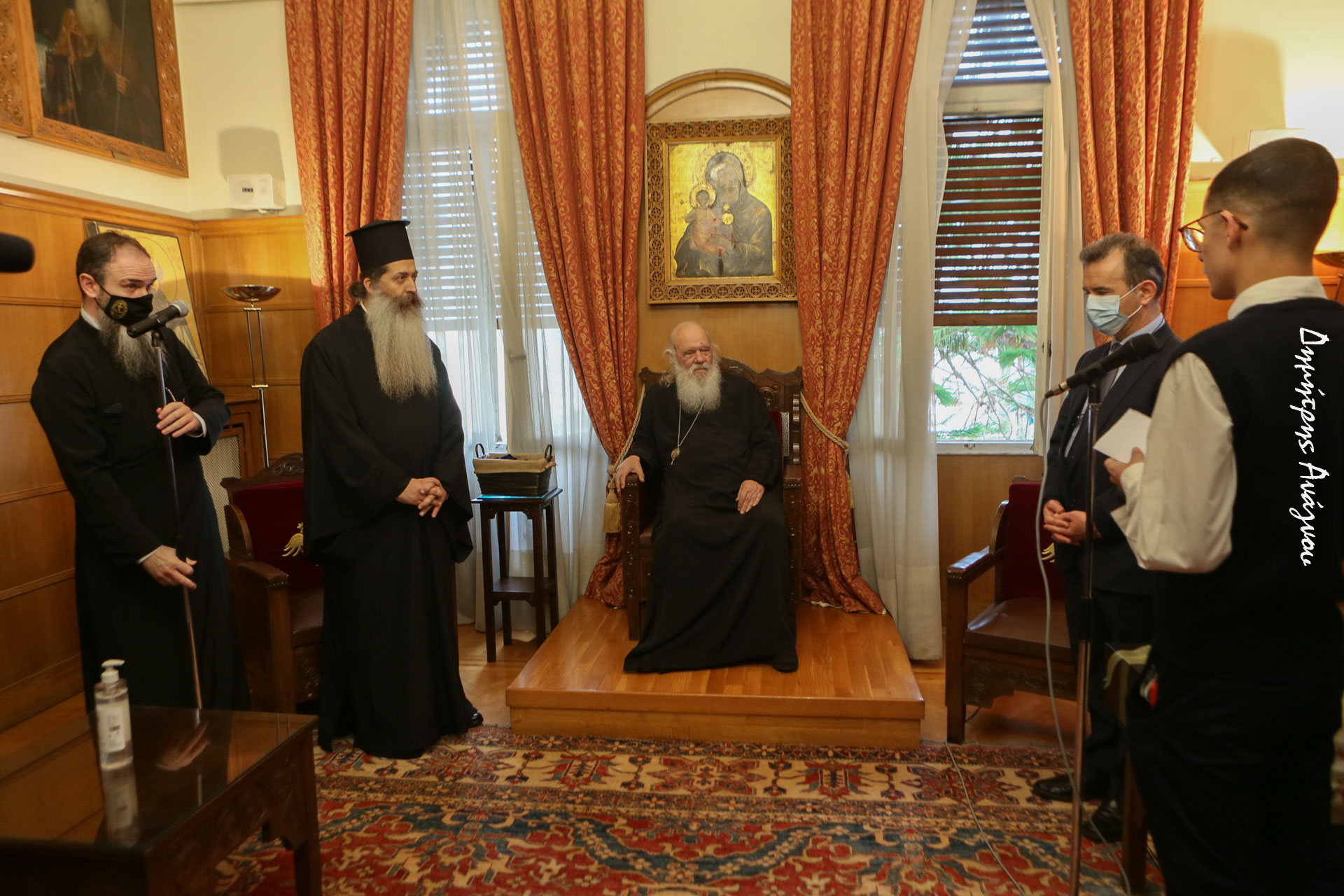 Ακολούθως οι μαθητές και οι εκπαιδευτικοί συνοδευόμενοι από τον Σεβασμιώτατο κ. Συμεών επισκέφθηκαν την Ιερά Αρχιεπισκοπή Αθηνών και έλαβαν την πατρική ευχή του Μακαριωτάτου Αρχιεπισκόπου Αθηνών και πάσης Ελλάδος κ.κ. Ιερωνύμου.
