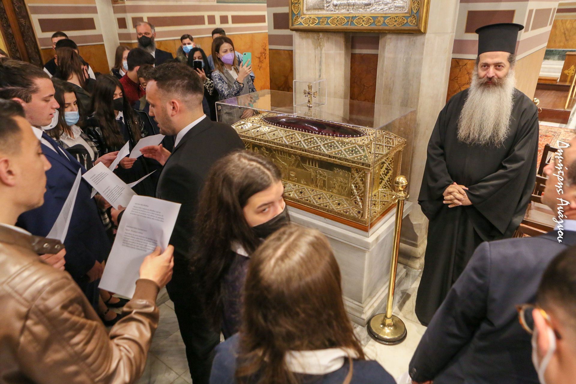Από πολύ νωρίς το πρωί, ο Σεβασμιώτατος κ. Συμεών μετέβη στο Πρότυπο Εκκλησιαστικό Σχολείο Λαμίας και συνόδευσε με τα λεωφορεία τα παιδιά με αρχικό προορισμό τον Ιερό Καθεδρικό Ναό Αθηνών «Ο Ευαγγελισμός της Θεοτόκου», όπου άπαντες προσεκύνησαν τα ιερά θησαυρίσματα, τα οποία φυλάσσονται στο Ναό, τα ιερά σκηνώματα της Οσίας Φιλοθέης της Αθηναίας και του Πατριάρχου Κωνσταντινουπόλεως Αγίου Γρηγορίου του Ε΄ και ξεναγήθηκαν στο Μουσείο του Μητροπολιτικού Ναού.