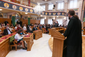 Στην συνέχεια η εκπαιδευτική ομάδα του Προτύπου Εκκλησιαστικού Σχολείου Λαμίας και οι συνοδοί τους επισκέφθηκαν την Ιερά Σύνοδο της Εκκλησίας της Ελλάδος, την Αίθουσα Συνεδριάσεων της Ιεράς Συνόδου της Ιεραρχίας της Εκκλησίας της Ελλάδος, όπου και ξεναγήθηκαν από τον Αρχιγραμματέα της Ιεράς Συνόδου της Εκκλησίας της Ελλάδος Θεοφιλέστατο Επίσκοπο Ωρεών κ. Φιλόθεο, ο οποίος και παρουσίασε τον τρόπο λειτουργίας των Συνοδικών Υπηρεσιών και γενικότερα μίλησε για την συνοδική διάρθρωση της Εκκλησίας μας.