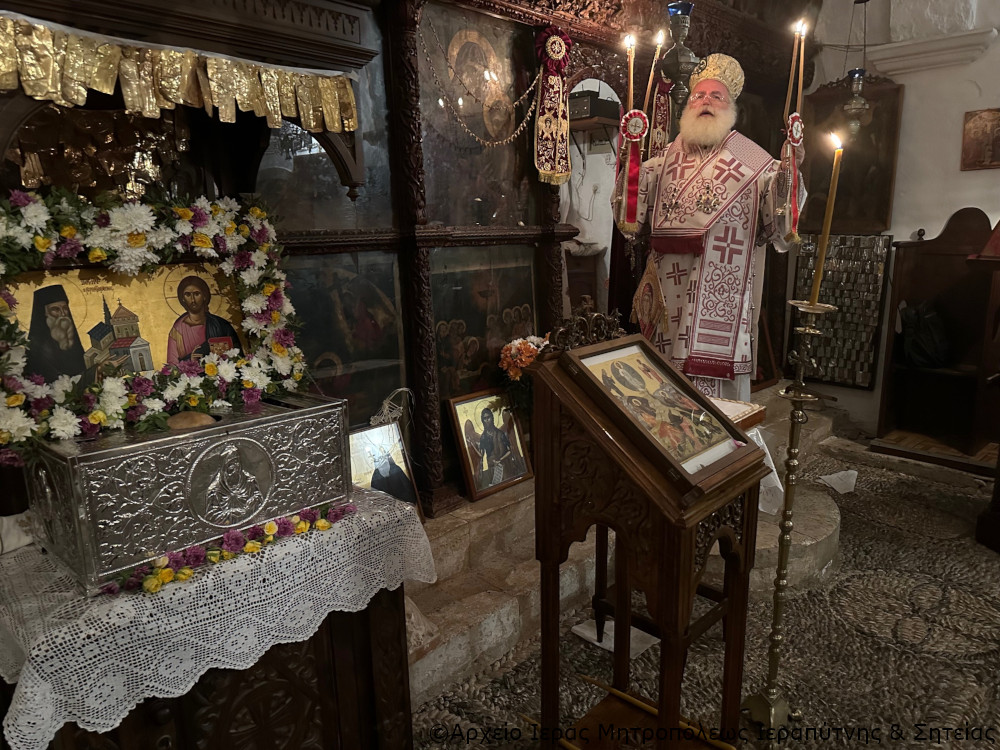 Στη συνέχεια ο Σεβ. χοροστάτησε κατά την Ακολουθία του Όρθρου και τέλεσε εντός του Καθολικού την Αρχιερατική Θεία Λειτουργία, ενώ στο τέλος ευλόγησε το κόλλυβο του αγίου.