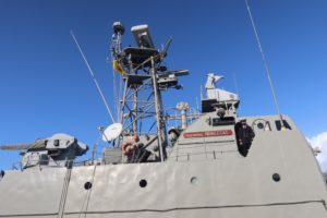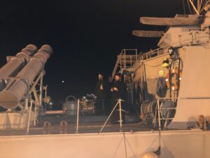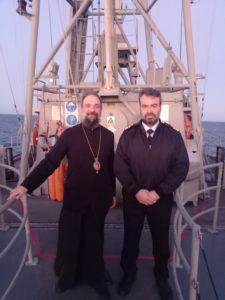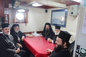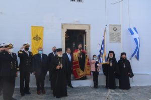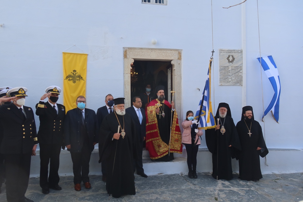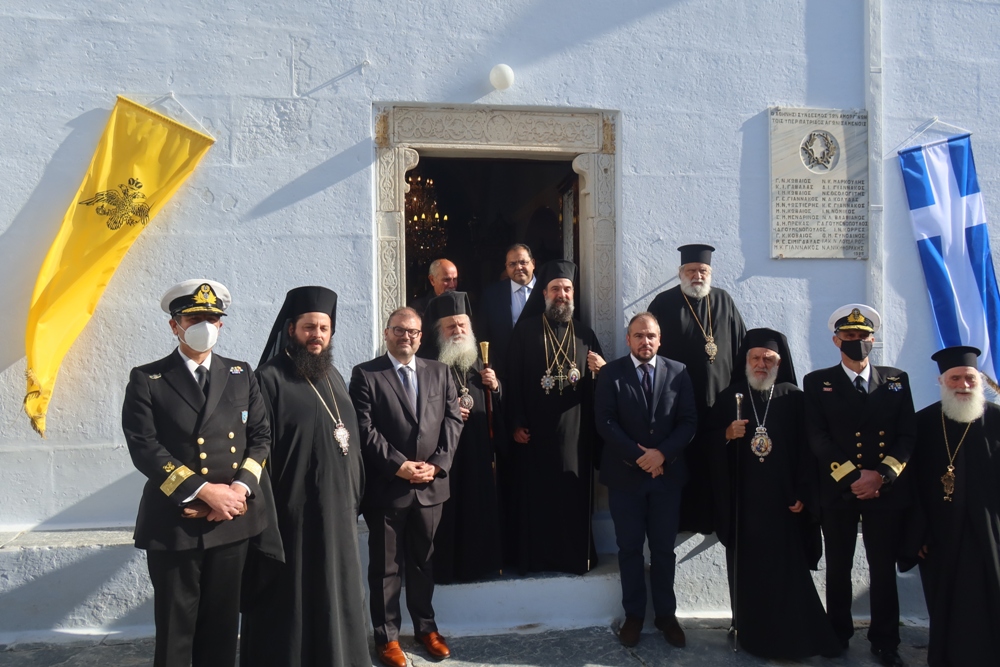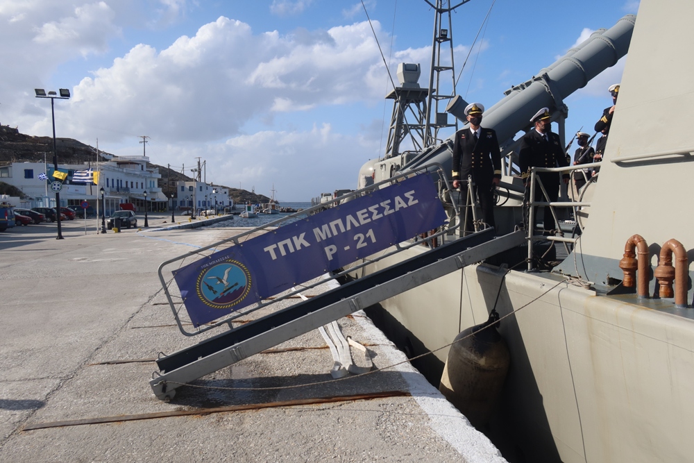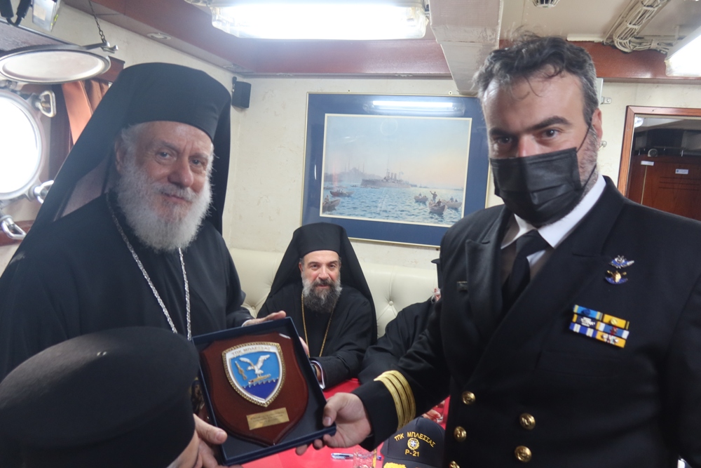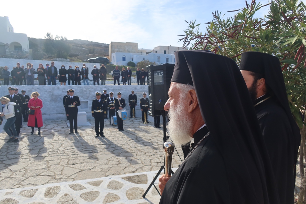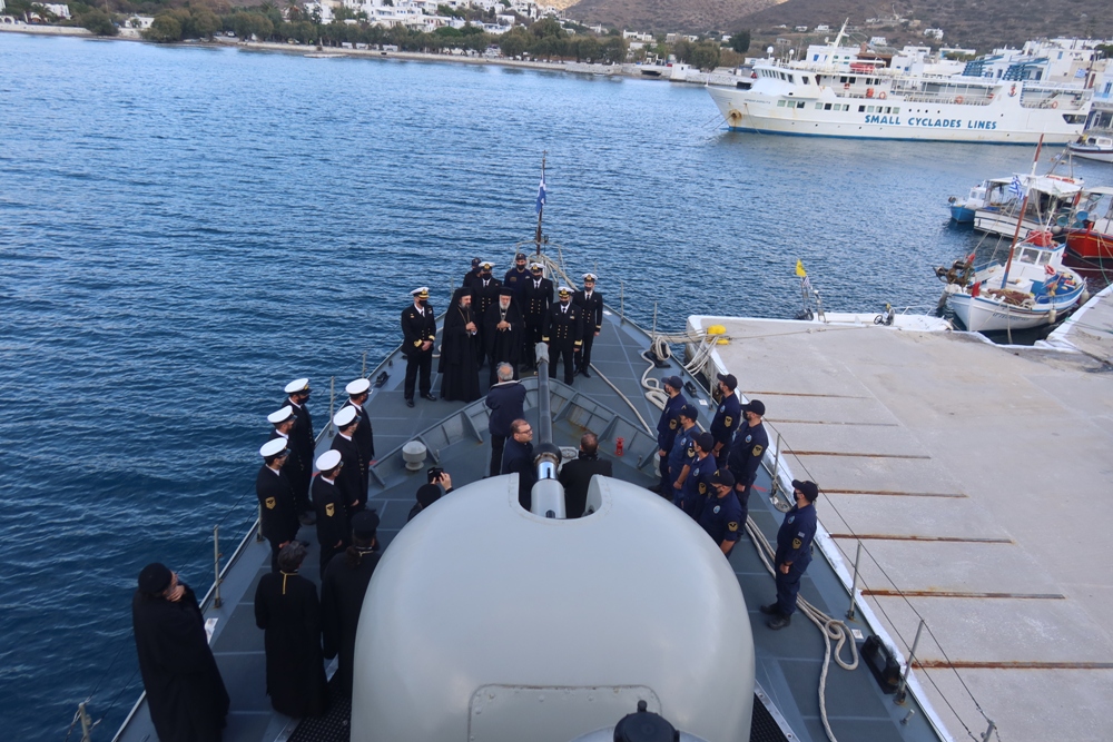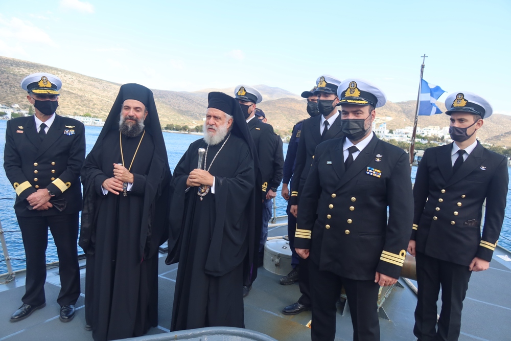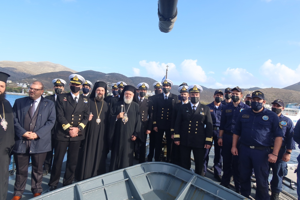 Στη συνέχεια, οι Σεβασμιώτατοι Σύρου κ. Δωρόθεος και Θήρας κ. Αμφιλόχιος επισκέφθηκαν το ελλιμενισμένο πλοίο του ΠΝ «ΜΠΛΕΣΑΣ», το οποίο έχει προσορμισθεί, προκειμένου να αποδώσει τιμές κατά την σημερινή αποκάλυψη σήματος στη μνήμη των τριών ηρώων πιλότων Ελικοπτέρων, που έπεσαν στη γειτονική νήσο Κίναρο και ευχήθηκαν στον Κυβερνήτη και το πλήρωμά του.