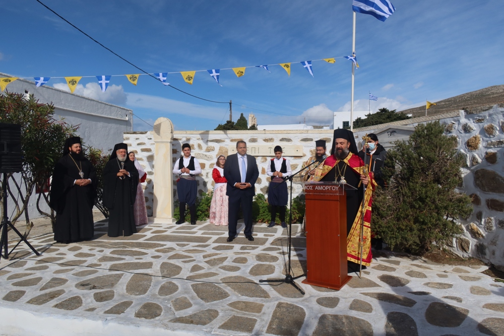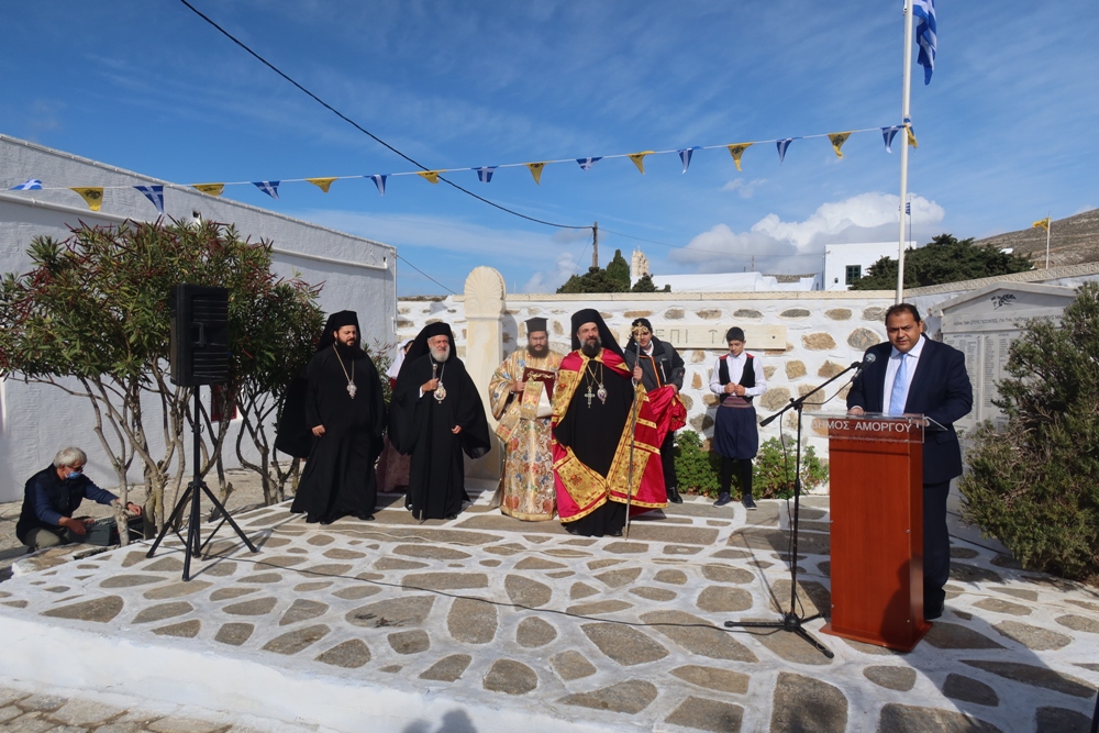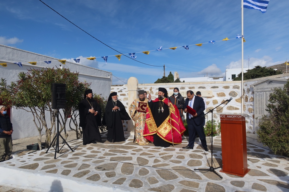 Τέλος, μίλησε ο Σεβασμιώτατος Μητροπολίτης Θήρας, Αμοργού και Νήσων κ. Αμφιλόχιος, εκφράζοντας την ευγνωμοσύνη του στο πρόσωπο του προκατόχου του Σεβ. κ. Επιφανίου, ενώ στην συνέχεια αναφέρθηκε με λυρισμό στην Αμοργό και τους κατοίκους της, τους οποίους κάλεσε να τον συνδράμουν στο έργο του και να συστρατευθούν όλοι στην αρχιερατική του διακονία.
