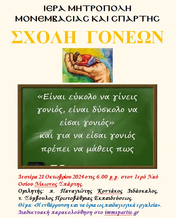 Οι ομιλίες γίνονται στον Ιερό Ναό Οσίου Νίκωνος Σπάρτης. Για το νέο σχολικό έτος η πρώτη συνάντηση θα πραγματοποιηθεί την Δευτέρα 21 Οκτωβρίου 2024, με ομιλητή τον Αιδεσιμολογιώτατο Πρωτοπρεσβύτερο, π. Παναγιώτη Κοντάκο, Διδάσκαλο, τ. Σύμβουλο Πρωτοβάθμιας Εκπαιδεύσεως και μέλος του διδακτικού προσωπικού του Ιδρύματος Ποιμαντικής Επιμορφώσεως της Ιεράς Αρχιεπισκοπής Αθηνών , ο οποίος θα αναπτύξει το θέμα: «Η ενθάρρυνση και τα όρια ως παιδαγωγικά εργαλεία».