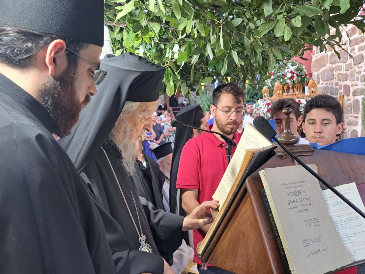 Την κυριώνυμο ημέρα της εορτής ο Σεβασμιώτατος Μητροπολίτης Καρυστίας και Σκύρου κ. Σεραφείμ, με συλλειτουργούς τον Πρωτοσύγκελλο Πανοσ Αρχιμ Νικόδημο Πόγκα, τους Πανοσ Αρχιμ Αρσένιο Τριανταφύλλου Αντώνιο Αγγελόπουλο και τον Διάκονο Στυλιανό Πεταχτή ετέλεσε στον προαύλειο χώρο της ιεράς μονής την Αρχιερατική Θεία Λειτουργία ενώπιον του ευπρεπισμένου και ανθοστόλιστου επιταφίου της Παναγίας με την συμμετοχή πολλών πιστών, που κατέκλυσαν το καθολικό της ιεράς μονής κατα το 2ήμερο της εορτής να τιμήσουν την εορτή.