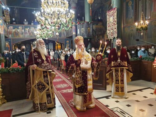 Από νωρίς το πρωί και παρόλο το τσουχτερό κρύο, με μία κατανυκτική ατμόσφαιρα εντός του ναού ιερείς και ποίμνιο ένωσαν τις προσευχές τους ως ελάχιστο δώρο στον νεογέννητο Χριστό, ενώ ο Σεβασμιώτατος στην ποιμαντορική εγκύκλιό του ζήτησε: