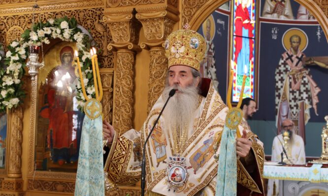 Σήμερα το πρωί τελέστηκε Αρχιερατική Θεία Λειτουργία, όπου στο κήρυγμά του ο Σεβασμιώτατος, αρχικά, ανέφερε πως «κάθε ημέρα που τιμάται η Υπεραγία Θεοτόκος αποκαλύπτεται με εκφαντορικό τρόπο, με θεμελιακό τρόπο, το υπεροχικό ‘’είναι’’ του Παναγίου Θεού. Το ανεπανάληπτο και υπερβατικό Του ήθος».