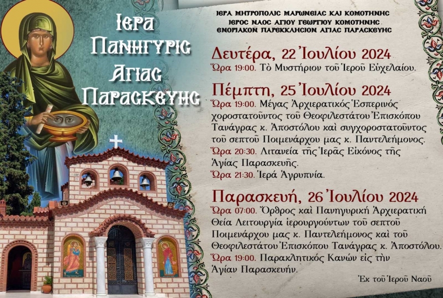 Ἐν ὄψει τῆς ἑορτῆς τῆς Ἁγίας Ὁσιοπαρθενομάρτυρος Παρασκευῆς, Προστάτιδος καὶ Πολιούχου τῆς Κομοτηνῆς, καθ’ ἥν ἑορτάζει ὁ ἱστορικός Ἱερός Ναός τῆς πόλεως, ἡ Ἱερά Μητρόπολη ἀνακοινώνει τὸ Πρόγραμμα τῶν Ἱερῶν Ἀκολουθιῶν ὡς ἑξῆς :