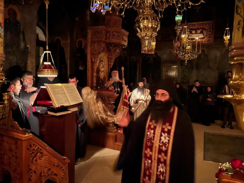 Ὁ Μακαριώτατος προεξῆρξε τῆς ὁλονυκτίου λειτουργίας, συλλειτουργούντων τοῦ Σεβασμιωτάτου Ἀρχιεπισκόπου Κωνσταντίνης κ. Ἀριστάρχου καί τοῦ Σεβασμιωτάτου Μητροπολίτου Ἑλενουπόλεως κ. Ἰωακείμ, τῶν Ἀρχιμανδριτῶν π. Χρυσογόνου καί π. Χριστοδούλου, τοῦ Ἀρχιδιακόνου π. Μάρκου καί τοῦ Ἱεροδιακόνου π. Δοσιθέου καί ψαλλόντων τοῦ κ. Σταύρου Χρήστου, Α΄ ψάλτου τοῦ Ἱεροῦ Ναοῦ Ἁγίας Παρασκευῆς τοῦ ὁμωνύμου Δήμου, κ. Σταύρου Ἰωάννου, Α΄ ψάλτου τοῦ Ἱεροῦ Ναοῦ Ἁγίου Δημητρίου Τριπόλεως, τοῦ κ. Σταύρου Πέτρου, Λαμπαδαρίου τοῦ Ἱεροῦ Ναοῦ Ὑπαπαντῆς τοῦ Χριστοῦ Καλαμάτας, κ. Θεοτοκάτου Νικολάου, Λαμπαδαρίου τοῦ Ἱεροῦ Ναοῦ Προφήτου Ἠλιοῦ Δήμου Ἁγίας Παρασκευῆς καί κ. Κάμτσιου Ἠλία, Α’ Ψάλτου τοῦ παρεκκλησίου Ἁγίων Ἀποστόλων ἐνορίας Ἁγίας Παρασκευῆς τοῦ ὁμωνύμου Δήμου καί προσευχομένων ὀλίγων μόνον μοναχῶν καί λαϊκῶν, λόγῳ τῶν ἐμποδίων τῆς ἐμπολέμου καταστάσεως.