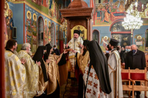 Τον Σεβασμιώτατο πλαισίωναν ο Πρωτοσύγκελος της Μητροπόλεως και Καθηγούμενος της Ιεράς Μονής Αγ. Βασιλείου, Πανοσιολ. Αρχιμ π. Ευσέβιος Σπουργίτης, ο Ηγούμενος της Ιεράς Μονής Αγίας Τριάδος Πέντε Βρύσεων, Πανοσιολ. Αρχιμ. π. Ιωάννης Αρσενιάδης και ο Γεν Αρχιερατικός Επίτροπος, Αιδεσιμ. Πρωτοπρεσβύτερος π. Αναστάσιος Παρούτογλού καθώς και Κληρικοί της καθ’ ημάς Μητροπόλεως, ενώ μεταξύ των προσκυνητών παρέστησαν και μέλη του Σωματείου «Άγιος Βασίλειος Βασιλειάδα», με επικεφαλής τον Πρόεδρο αυτού κ. Ιωάννη Λεοντιάδη.