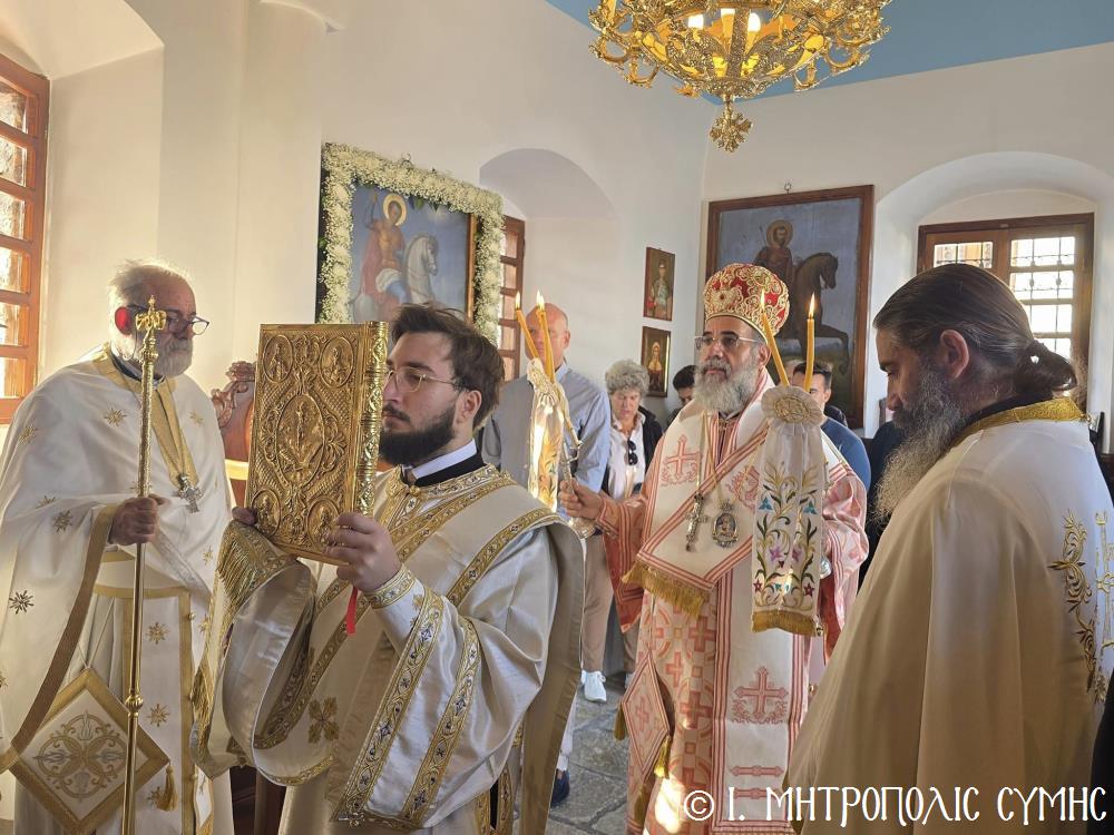 Ὁ Σεβ. Μητροπολίτης μας κ. Χρυσόστομος χοροστάτησε στόν Ὄρθρο, εὐλόγησε τούς προσφερομένους Ἄρτους καί τέλεσε τήν Θεία Λειτουργία, μέ συλλειτουργούς του τόν π. Στέφανο Μακρῆ, Γεν. Ἀρχιερατικό Ἐπίτροπο, τόν π. Γεώργιο Κακακιό, Ἐφημέριο τοῦ Ἁγίου Δημητρίου Σύμης καί τόν Ἱεροδιάκονο π. Παῦλο Τερεζάκη, ἐνῶ τό ἱ. Ἀναλόγιο διακόνησαν μελιρρύτως οἱ Ἱεροψάλτες κ. Δημοσθένης Γιανναράς καί κ. Ἐλευθέριος Ξηράκης μεθ’ ἑτέρων.