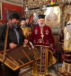 Τέλος εψάλησαν, με τη συνοδεία του παραδοσιακού οργάνου «κανονάκι» από τον κ. Γρύμπλα, τα παραδοσιακά κάλαντα της Μυκόνου «Άγιος Βασίλης έρχεται από τις κάτω Δήλες κι’ έχει το καλαθάκι του γεμάτο πεταλίδες»!
