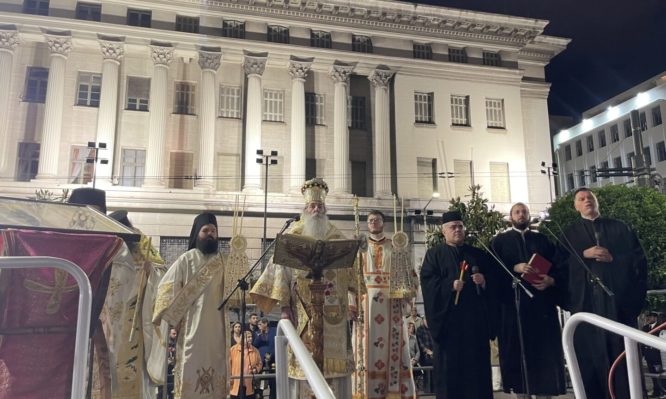 Μετά το «Δεύτε λάβετε Φως…» και την μετάδοση του Αγίου Φωτός, κλήρος και λαός με επικεφαλής τον Σεβασμιώτατο κατευθύνθηκαν στην ειδική εξέδρα που είχε τοποθετηθεί στον αύλειο χώρο του Καθεδρικού μας Ναού και εκφωνήθηκε η Πασχάλιος Ποιμαντορική Εγκύκλιος του Σεβασμιωτάτου από τον Ιεροκήρυκα της Ιεράς Μητροπόλεως Πειραιώς και προϊστάμενο του Ναού Αρχιμανδρίτη Δανιήλ Ψωίνο. Στην συνέχεια, μετά την ανάγνωση του Ιερού Ευαγγελίου ο Σεβασμιώτατος Μητροπολίτης Πειραιώς κ.Σεραφείμ ανήγγειλε το χαρμόσυνο μήνυμα της Αναστάσεως, ψάλλοντας το «Χριστός Ανέστη».