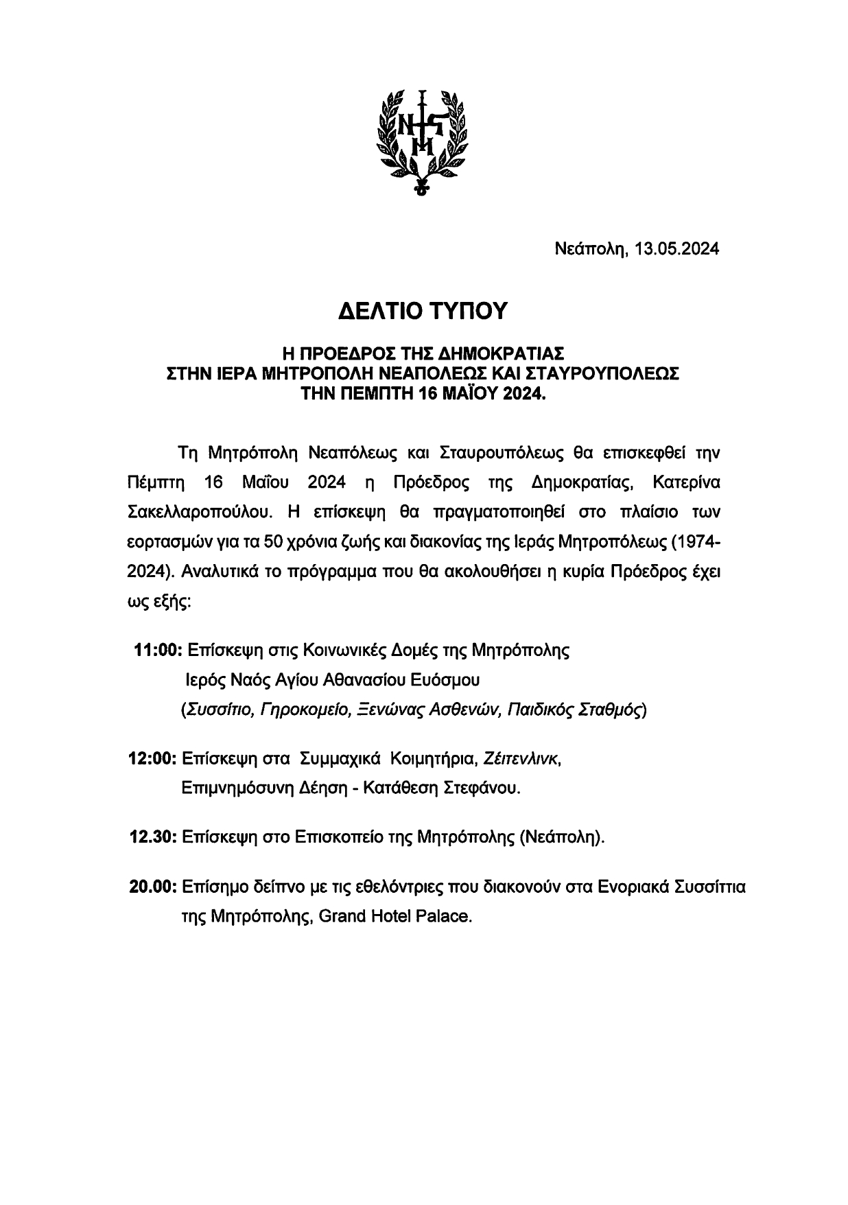 Η Πρόεδρος της Δημοκρατίας στη Μητρόπολη Νεαπόλεως και Σταυρουπόλεως ΕΛΛΑΔΑ, ΜΗΤΡΟΠΟΛΕΙΣ 16.05.2024 | 17:30 Η ΠτΔ στη Νεάπολη Θεσ/νίκης