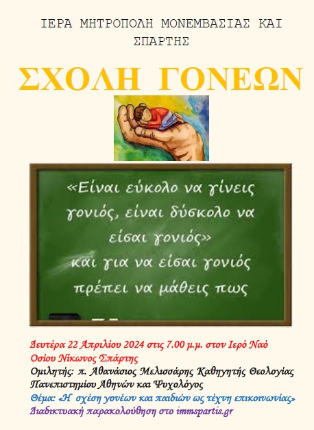 Την Δευτέρα 22 Απριλίου 2024 στις 19.00, στον Ι.Ν. Οσίου Νίκωνος Σπάρτης, στο πλαίσιο της Σχολής Γονέων της Ιεράς Μητροπόλεώς μας, θα πραγματοποιηθεί ομιλία από τον π. Αθανάσιο Μελισσάρη, καθηγητή θεολογίας του Πανεπιστημίου Αθηνών και ψυχολόγο.
