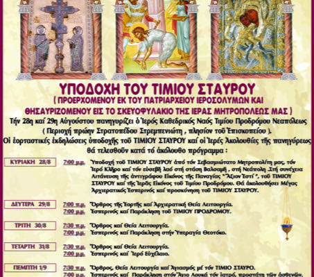 Πανηγυρίζει ο Ι. Ναός Τιμίου Προδρόμου Νεαπόλεως, την Κυριακή 28 και Δευτέρα 29 Αυγούστου, επί τη εορτή της Αποτομής της Τιμίας Κεφαλής του Τιμίου Προδρόμου, σύμφωνα με το κάτωθι Πρόγραμμα:
