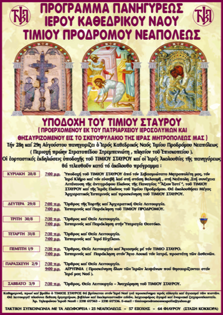 Πανηγυρίζει ο Ι. Ναός Τιμίου Προδρόμου Νεαπόλεως, την Κυριακή 28 και Δευτέρα 29 Αυγούστου, επί τη εορτή της Αποτομής της Τιμίας Κεφαλής του Τιμίου Προδρόμου, σύμφωνα με το κάτωθι Πρόγραμμα: