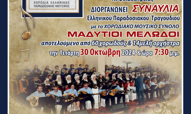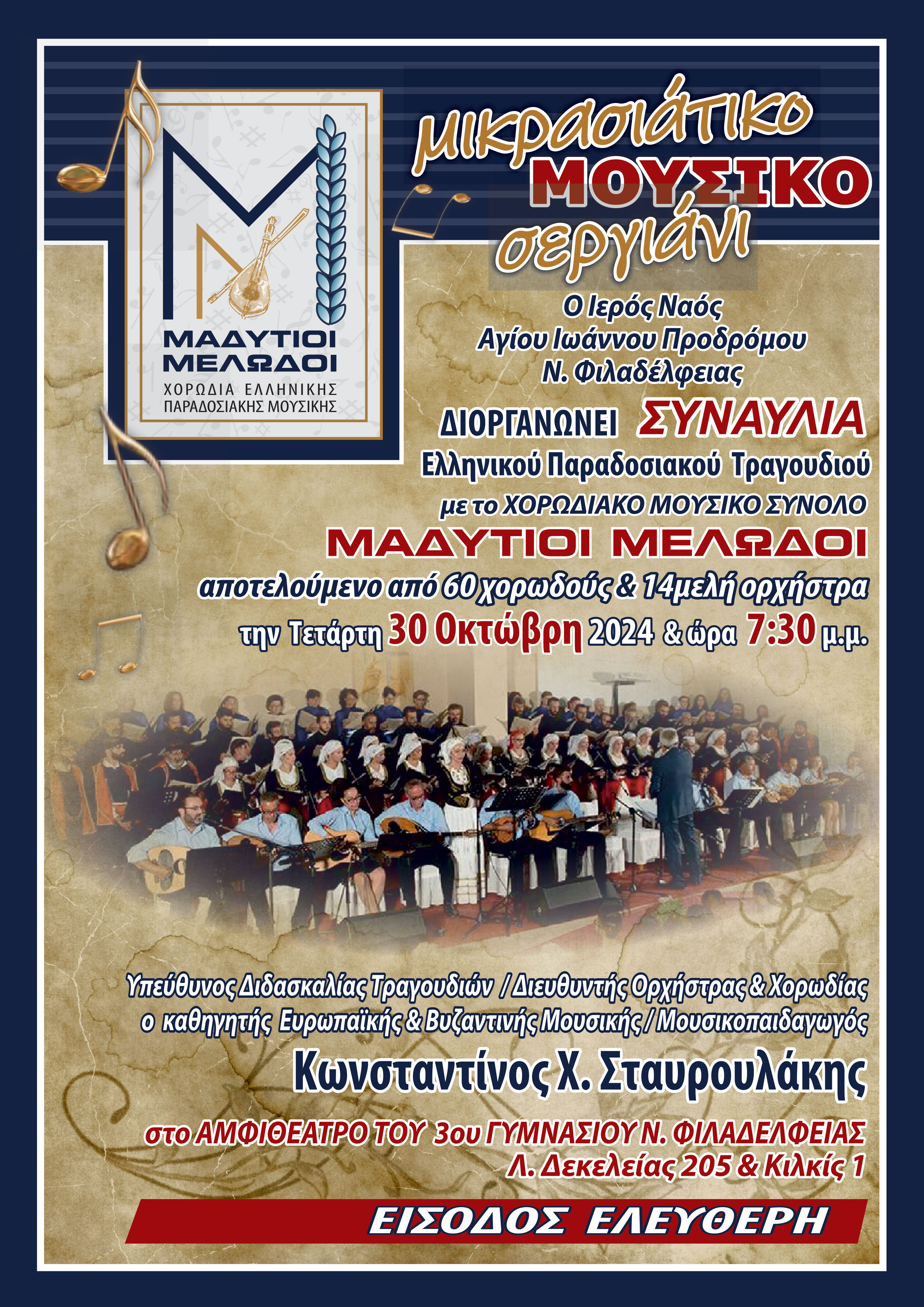 Μια ξεχωριστή Συναυλία Παραδοσιακού τραγουδιού, με τίτλο «Μικρασιάτικο μουσικό σεργιάνι», με 14μελής ορχήστρα και 60 χορωδούς διοργανώνει ο Ι. Ναός Αγίου Ιωάννου Φιλαδέλφειας, την Τετάρτη, 30 Οκτωβρίου 2024, στις 19:30, στο Αμφιθέατρο του 3ου (τρίτου) Γυμνασίου Ν. Φιλαδέλφειας, επί των οδών Λ. Δεκελείας 205 και Κιλκίς 1.