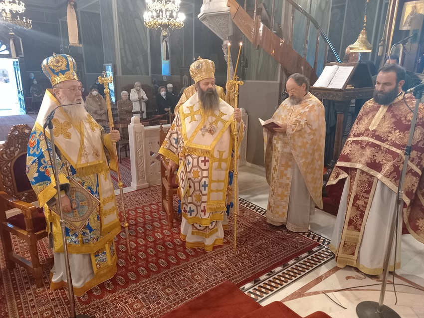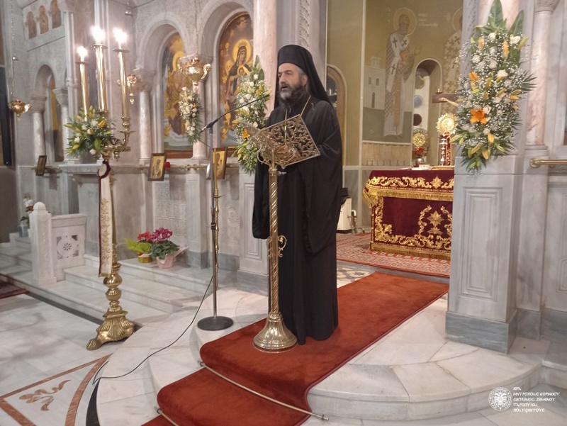 Πριν το τέλος της Θείας Λειτουργίας ο Σεβασμιώτατος αναφέρθηκε στην τρέχουσα επικαιρότητα και στα όσα θλιβερά συμβαίνουν τονίζονται ότι, οι Άγιοι της Εκκλησίας μας μιλούν για όλα αυτά τα θέματα που μας απασχολούν πολύ πριν «ξυπνήσουν» οι «έξυπνοι» της εποχής μας. Φτάσαμε στο σημείο αυτά που λένε οι Άγιοι να τα θεωρούμε οπισθοδρομικά και αυτά που λένε οι «εγκληματίες» να τα θεωρούμε προοδευτικά. Συν τοις άλλοις καταντήσαμε να προτιμούμε να ζούμε την ζωή από τις οθόνες των υπολογιστών, από το να ζούμε την πραγματικότητα.