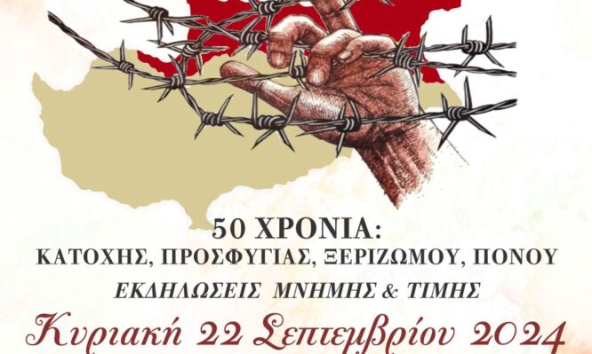Η Ιερά Μητρόπολη Μονεμβασίας και Σπάρτης διοργανώνει την προσεχή Κυριακή 22 Σεπτεμβρίου 2024 εκδηλώσεις μνήμης, για την θλιβερή επέτειο της συμπληρώσεως 50 ετών από την τουρκική εισβολή στην μαρτυρική Κύπρο, με θέμα: ‘’Κύπρος: 50 χρόνια κατοχής, προσφυγιάς, ξεριζωμού, πόνου’’.