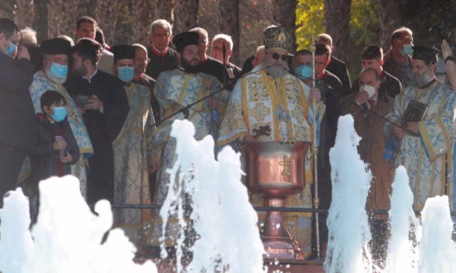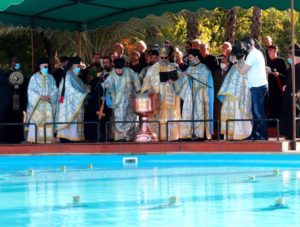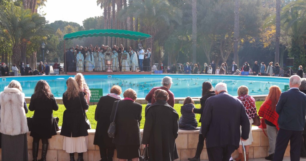 Εκεί ο Μητροπολίτης Ταμασού, από ειδικής εξέδρας, τέλεσε τον Καθαγιασμό των Υδάτων, ρίχνοντας τον Τίμιο και Ζωοποιό Σταυρό στο συντριβάνι.