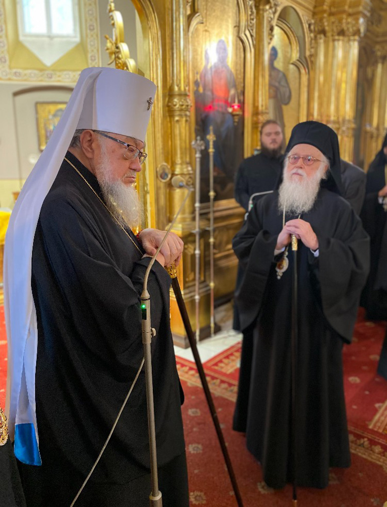 Τον Μακαριώτατο συνοδεύουν: ο Σεβασμιώτατος Μητροπολίτης Κορυτσάς κ. Ιωάννης και ο Ιερολογιώτατος Διάκονος π. Σπυρίδων.