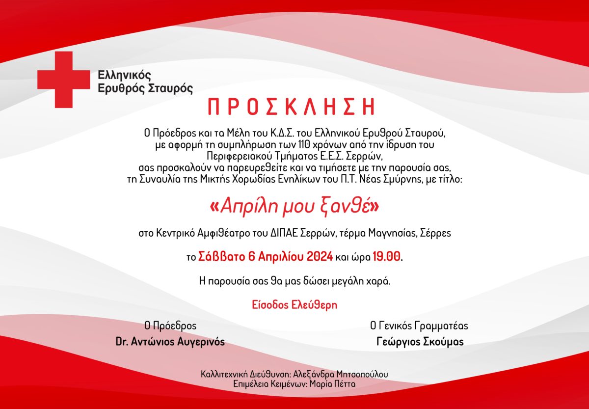 Ο Ελληνικός Ερυθρός Σταυρός, με αφορμή τη συμπλήρωση 110 χρόνων από την ίδρυση του Περιφερειακού Τμήματος Ε.Ε.Σ. Σερρών, διοργανώνει το Σάββατο 6 Απριλίου 2024, και ώρα 19:00΄, στο Κεντρικό Αμφιθέατρο του ΔΙΠΑΕ Σερρών (πρώην ΤΕΙ)μεγάλη ανοικτή για το κοινό συναυλία της Μικτής Χορωδίας Ενηλίκων του Περιφερειακού Τμήματος Νέας Σμύρνης του Ελληνικού Ερυθρού Σταυρού, με τίτλο: «Απρίλη μου Ξανθέ».