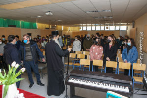 Ευχαρίστησε εγκαρδίως τον Διευθυντή του Σχολείου κ. Γεώργιο Καραγεώργο για την πρόσκληση και την υποδοχή και για αρκετή ώρα είχε την ευκαιρία ουσιαστικής επικοινωνίας με τους καθηγητές και τους μαθητές, στους οποίους και διένειμε διάφορες ευλογίες.