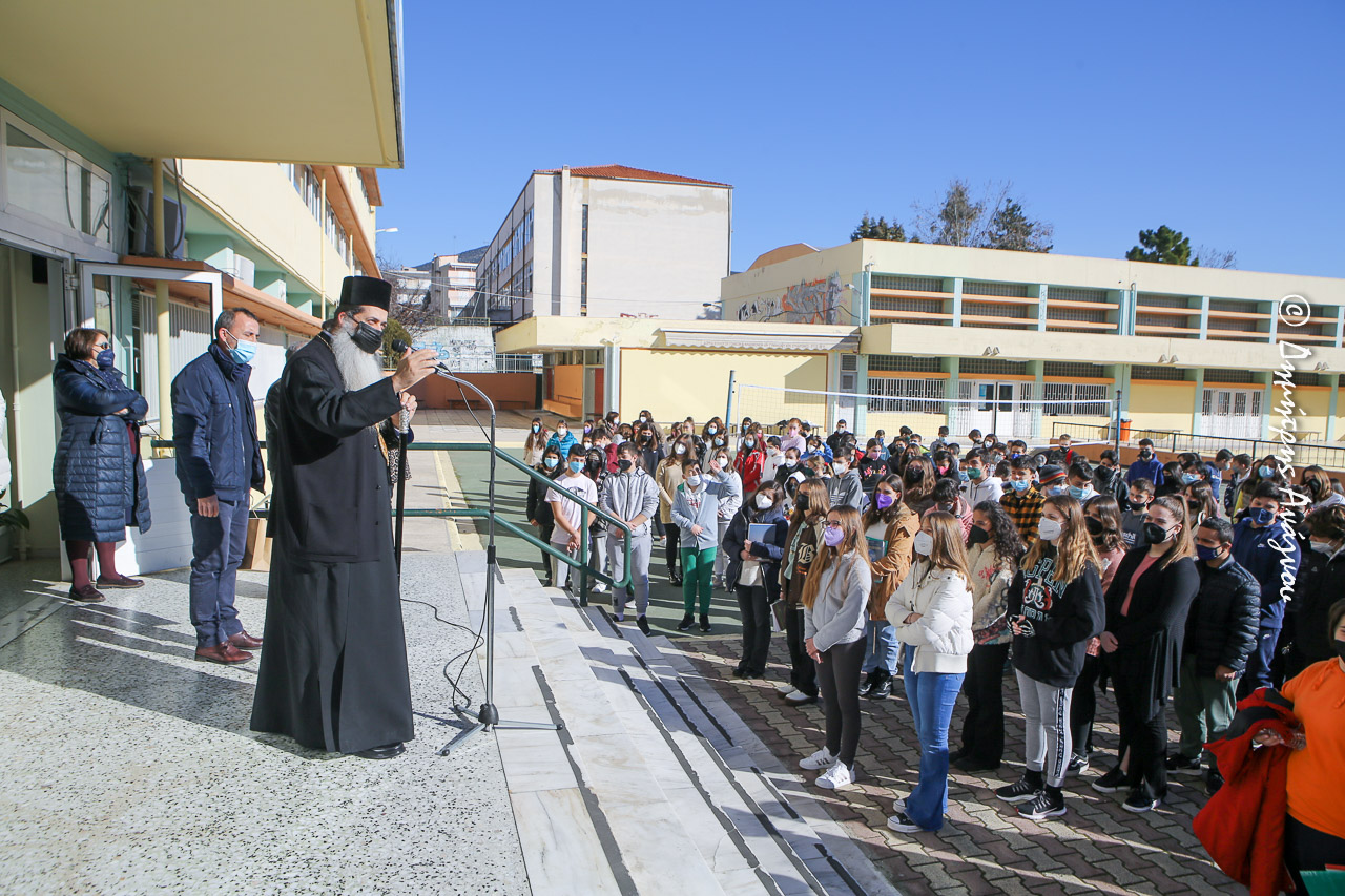 Αρχικά ο Σεβασμιώτατος κ. Συμεών στο προαύλιο του σχολείου ευχήθηκε πατρικά σε όλους τους μαθητές και τις μαθήτριες του σχολείου καλή πρόοδο και αναφέρθηκε στην αιτία της καλής προόδου του ανθρώπου, που είναι η αγάπη και ο αλληλοσεβασμός στον συνάνθρωπο και εν προκειμένω στον συμμαθητή μας, όπως τόνισε.