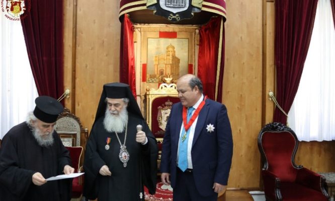 Ὁ ἐξοχώτατος Πρέσβυς ἐγένετο δεκτός ὑπό τοῦ Πατρός ἡμῶν καί Πατριάρχου Ἱεροσολύμων κ.κ. Θεοφίλου καί Ἁγιοταφιτῶν Πατέρων καί ηὐχαρίστησε τόν Μακαριώτατον ἐπί τῇ ἀφυπηρετήσει αὐτοῦ διά τήν λίαν καλήν συνεργασίαν Αὐτοῦ μετά τῆς χώρας αὐτοῦ εἰς διαθρησκειακά καί εἰρηνευτικά θέματα καί τάς ἐπισκέψεις Αὐτοῦ εἰς συνέδρια διοργανωθέντα εἰς τήν χώραν αὐτοῦ καί ἀπένειμεν Αὐτῷ τό ἀνώτατον παράσημον τῆς χώρας αὐτοῦ.