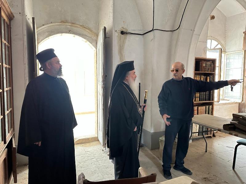 Περί τήν μεσημβρίαν τῆς Δευτέρας, 23ης Ἰανουαρίου / 5ης Φεβρουαρίου 2024, ἡ Α.Θ.Μ. ὁ Πατήρ ἡμῶν καί Πατριάρχης Ἱεροσολύμων κ.κ. Θεόφιλος ἐπεσκέφθη τήν Ἱεράν Μονήν τοῦ Τιμίου Σταυροῦ, ἡγούμενος τῆς ὁποίας εἶναι ὁ Γέρων Δραγουμᾶνος Ἀρχιμανδρίτης π. Ματθαῖος καί ἐπεθεώρησε τάς συνεχιζομένας ἐν αὐτῇ ἐργασίας ὑπό τοῦ ἐκ Κύπρου εἰδήμονος συντηρητοῦ κ. Σταύρου Ἀνδρέου καί ἔδωσεν αὐτῷ τάς ἀπαιτουμένας ὁδηγίας διά τήν στέγασιν τοῦ κέντρου Θεολογικῶν Ἐρευνῶν, τήν ἵδρυσιν τοῦ ὁποίου ἔχει ἀποφασίσει ἡ Ἁγία καί Ἱερά Σύνοδος τοῦ Πατριαρχείου Ἱεροσολύμων.