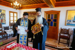 Τον Σεβασμιώτατο υποδέχθηκε με αισθήματα υιικού σεβασμού και βαθυτάτης αγάπης, ο Καθηγούμενος της Μονής Αρχιμ. π. Εφραίμ Τράνακας και τον καλωσόρισε για ακόμη μία φορά στο Μοναστήρι, ενώ τον ευχαρίστησε για την ευλογία της παρουσίας του και για την πατρική του στήριξη, την οποία ο Ποιμενάρχης επιδεικνύει με κάθε δυνατό τρόπο.