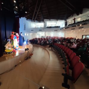 Αρκετοί γονείς με τα παιδιά τους κάθε ηλικίας και τηρώντας τα προβλεπόμενα υγειονομικά πρωτόκολλα, προσέρχονται στο φιλόξενο Αμφιθέατρο της Μητροπόλεως στο Πνευματικό και Διοικητικό Κέντρο στη Λαμία για να παρακολουθήσουν την παιδική αυτή θεατρική παράσταση την οποία παρουσιάζει η Θεατρική Ομάδα «LaFamiglia».