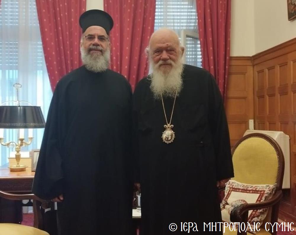Ὁ Σεβ. Ποιμενάρχης μας κ. Χρυσόστομος προσέφερε τιμητικῶς στόν Μακαριώτατον Προκαθήμενον τῆς καθ’ Ἑλλάδα Ἐκκλησίας κ. Ἱερώνυμον, τόν, ὑπό τῆς Ἱ. Μητροπόλεώς μας ἐκδοθέντα προσφάτως, Ἐπετειακόν Τόμον «100 χρόνια Πανορμίτειο Γυμνάσιο Σύμης», ὡς καί ἀργυρόν ἀντίγραφον τῆς Ἱ. Εἰκόνας τοῦ Ταξιάρχου μας Μιχαήλ τοῦ Πανορμίτου.