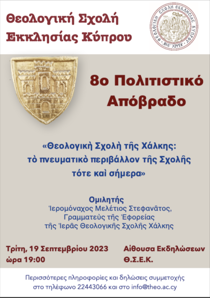 Η Θεολογική Σχολή Εκκλησίας Κύπρου σας προσκαλεί σε διάλεξη που θα πραγματοποιηθεί την Τρίτη 19 Σεπτεμβρίου 2023, ώρα 19:00-20:30, στην Αίθουσα Εκδηλώσεων της Σχολής (Ισοκράτους 1-7, 1016, Λευκωσία) με τίτλο: