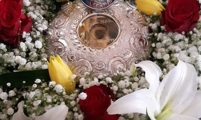 Κατά τη διάρκεια της Αγρυπνίας θα τεθεί για προσκύνηση απότμημα Ιερού Λειψάνου του Αγίου Μηνά που φυλάσσεται στον Ναό.