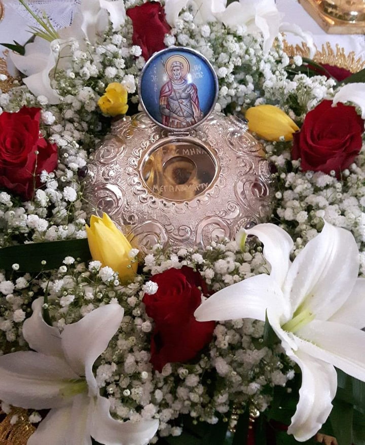 Κατά τη διάρκεια της Αγρυπνίας θα τεθεί για προσκύνηση απότμημα Ιερού Λειψάνου του Αγίου Μηνά που φυλάσσεται στον Ναό.