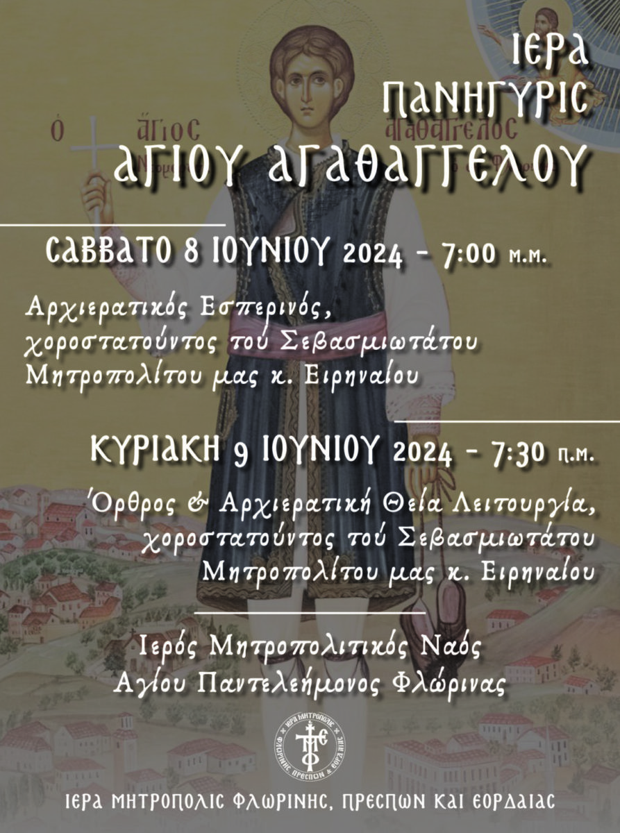 Την Κυριακή, 9 Ιουνίου, η Εκκλησία μας τιμά τη μνήμη τού αγίου μάρτυρος Αγαθαγγέλου τού εκ Φλωρίνης, ο οποίος γεννήθηκε, έζησε και μαρτύρησε στη Φλώρινα και το Μοναστήρι (Μπίτολα) στις αρχές τού 18ου αιώνα.