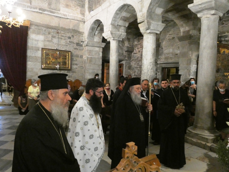 Προ του «Δι’ ευχών», ο Μητροπολίτης απηύθυνε ευχές προς τους ιερείς και τους πιστούς, εν όψει της μεγάλης Θεομητορικής εορτής της Κοιμήσεως της Υπεραγίας Θεοτόκου.