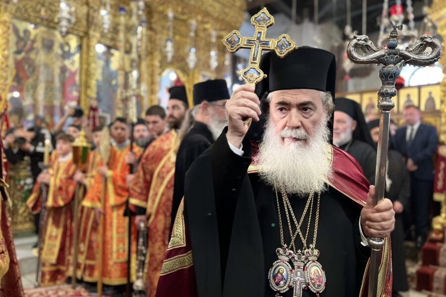 Εἰσελθών ὁ Μακαριώτατος εἰς τήν Βασιλικήν καί ἐν ᾧ δεξιά Αὐτοῦ ἵστατο ὁ Γενικός Πρόξενος τῆς Ἑλλάδος εἰς τά Ἱεροσόλυμα κ. Δημήτριος Ἀγγελοσόπουλος διῆλθε τό Καθολικόν, ὅπερ δικαίωμα μοναδικόν τῶν Ὀρθοδόξων, ἦλθεν εἰς τόν χῶρον πρό τοῦ εἰκονοστασίου καί ἐν συνεχείᾳ κατηυθύνθη πρός τό Θεοδέγμον Σπήλαιον διά τῆς νοτίου πύλης αὐτοῦ.