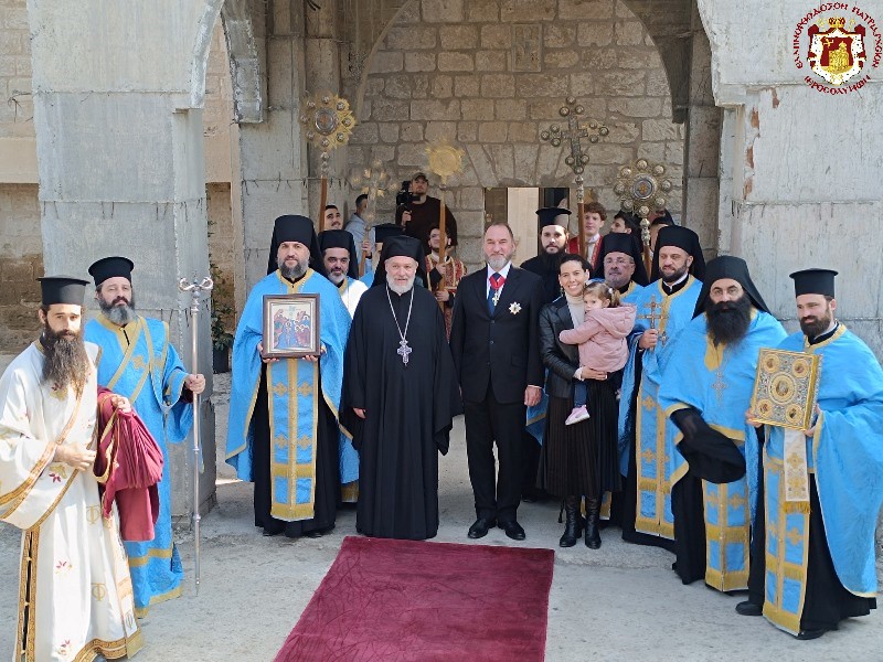 Ἀκολούθως, τήν 9:00 π.μ. ὥραν ἡ Α.Θ.Μ. ἀνεχώρησε διά τήν Ἱεριχώ, ὅπου ἐπεσκέφθη α. τήν Ἱεράν Μονήν τοῦ Προφήτου Ἐλισσαίου καί τῆς Συκομορέας τοῦ Ζακχαίου, ὅπου ἐδέχθη μικράν ἀναψυχήν ὑπό τοῦ ἡγουμένου Ἀρχιμανδρίτου π. Παρθενίου, β. τήν Νομάρχην τῆς Ἱεριχοῦς κ. Γιούσρα Σουέτη καί ἔφθασεν εἰς τήν Ἱεράν Μονήν τοῦ Τιμίου Προδρόμου, ἀνακαινισθεῖσαν ὑπό τοῦ Τελετάρχου τοῦ Πατριαρχείου Ἀρχιμανδρίτου π. Βαρθολομαίου, ἔνθα καί ἀνεγνώσθη ἡ Θ’ Ὤρα.