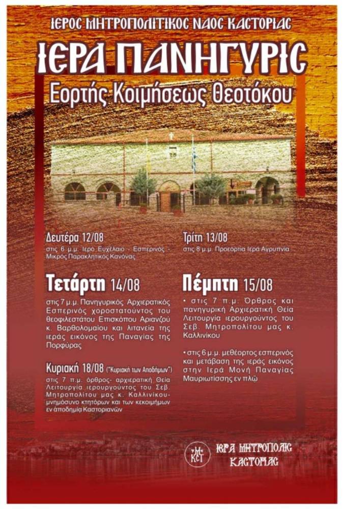 Πρόγραμμα Ιεράς Πανηγύρεως του Ιερού Μητροπολιτικού Ναού Κοιμήσεως της Θεοτόκου Καστοριάς Δόγμα 10 Αυγούστου 2024 20:32 Tags: ΙΕΡΑ ΜΗΤΡΟΠΟΛΗ ΚΑΣΤΟΡΙΑΣ