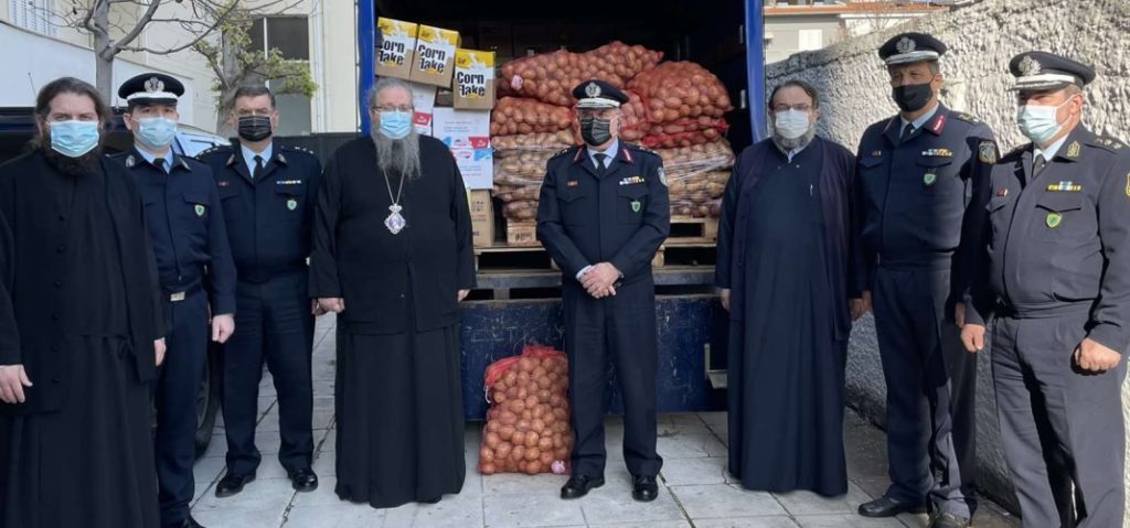 Τη μεγάλη ποσότητα τροφίμων παρέδωσαν στον Σεβασμιώτατο Μητροπολίτη Λαρίσης και Τυρνάβου κ. Ιερώνυμο και στον Πανοσιολ. Αρχιμανδρίτη κ. Βαρθολομαίο Μαργαριτόπουλο, υπεύθυνο των Συσσιτίων της Ιεράς Μητροπόλεως, ο Ταξίαρχος κ. Αστέριος Μαντζιώκας, Γενικός Περιφερειακός Αστυνομικός Διευθυντής Θεσσαλίας και ο Ταξίαρχος κ. Χρήστος Σιμούλης, Αστυνομικός Διευθυντής Νομού Λαρίσης με ομάδα αστυνομικών.
