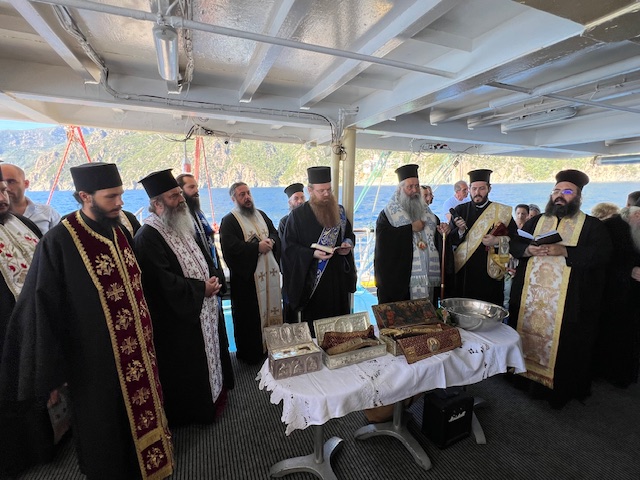 Μπροστά στο θαλάσσιο χώρο της Ιεράς Μονής Διονυσίου, πατέρες της Ιεράς Μονής μετέφεραν επί του πλοίου ι. Λείψανα προς ευλογία των πιστών. Συγκεκριμένα, τέθηκαν σε προσκύνηση το δεξί χέρι του Τιμίου Προδρόμου και τεμάχια λειψάνων των Αγίων Γεωργίου Τροπαιοφόρου και Μεγαλομάρτυρος Παρασκευής.