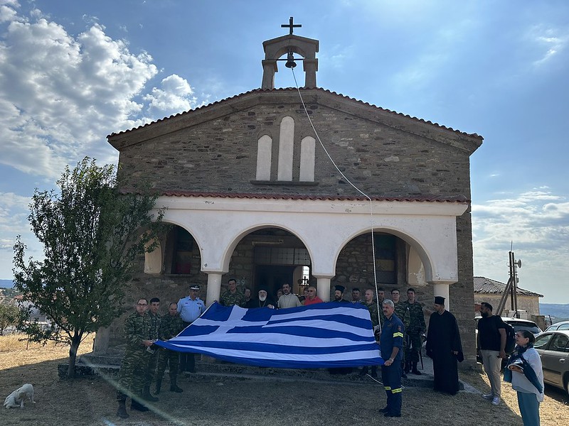 Εμπνεόμενος ο Σεβασμιώτατος από το ποίημα του Άγγελου Βλάχου « Εις το βουνό ψηλά εκεί/είναι εκκλησιά ερημική/το σήμαντρό της δεν χτυπά/δεν έχει ψάλτη ουδέ παπά…» με πολλή συγκίνηση, προ του πέρατος της Θείας Λειτουργίας, μνημόνευσε τους κεκοιμημένους και σημείωσε την υποχρέωση όλων μας για να λειτουργούνται με κάθε ευκαιρία οι εκκλησίες μας και να λατρεύεται σε αυτές ο Κύριος. Στο τέλος, όλοι έψαλλαν τον εθνικό ύμνο και ύψωσαν την γαλανόλευκη.